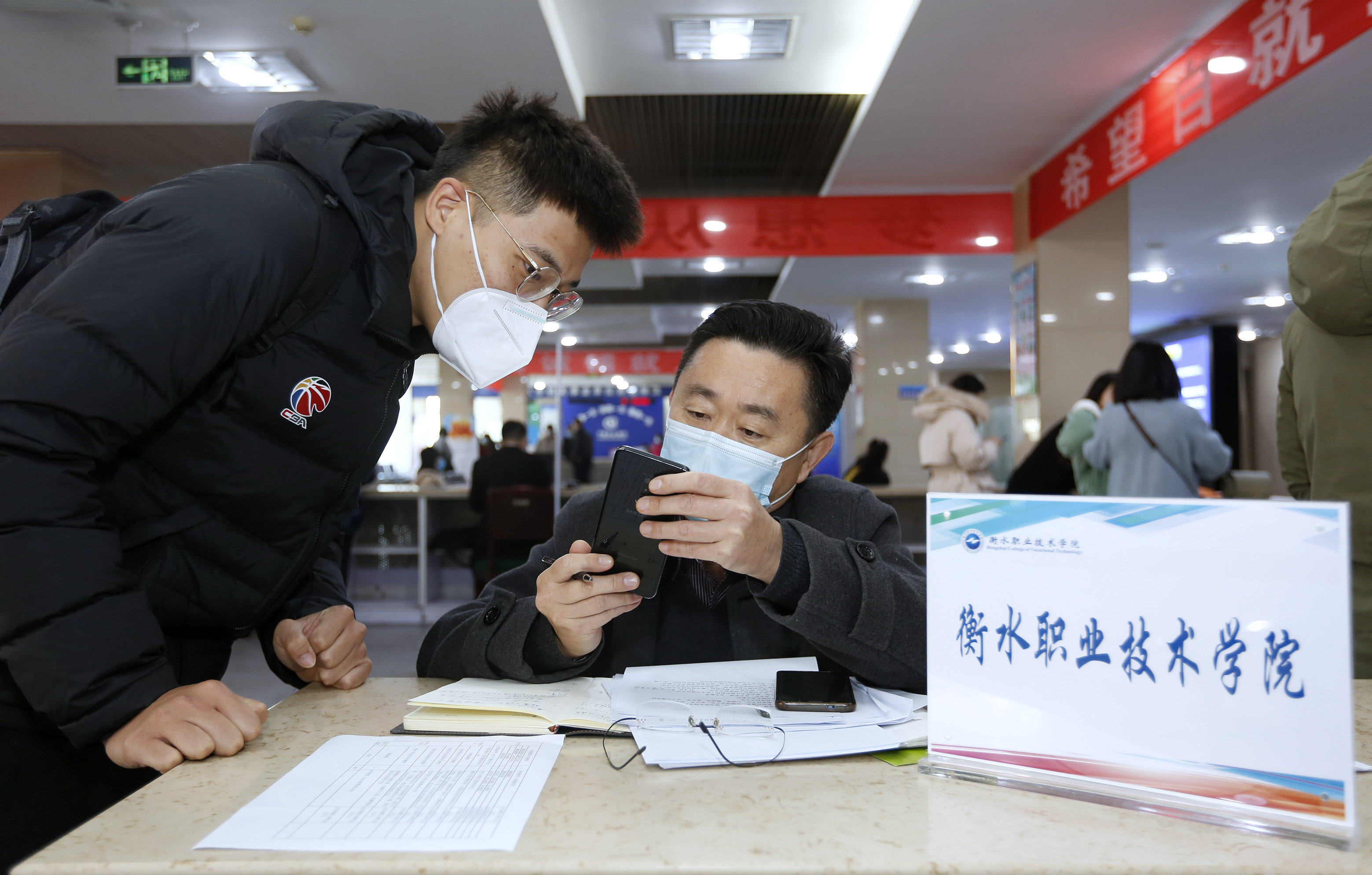 应聘者在衡水职业技术学院展位前咨询相关岗位要求。