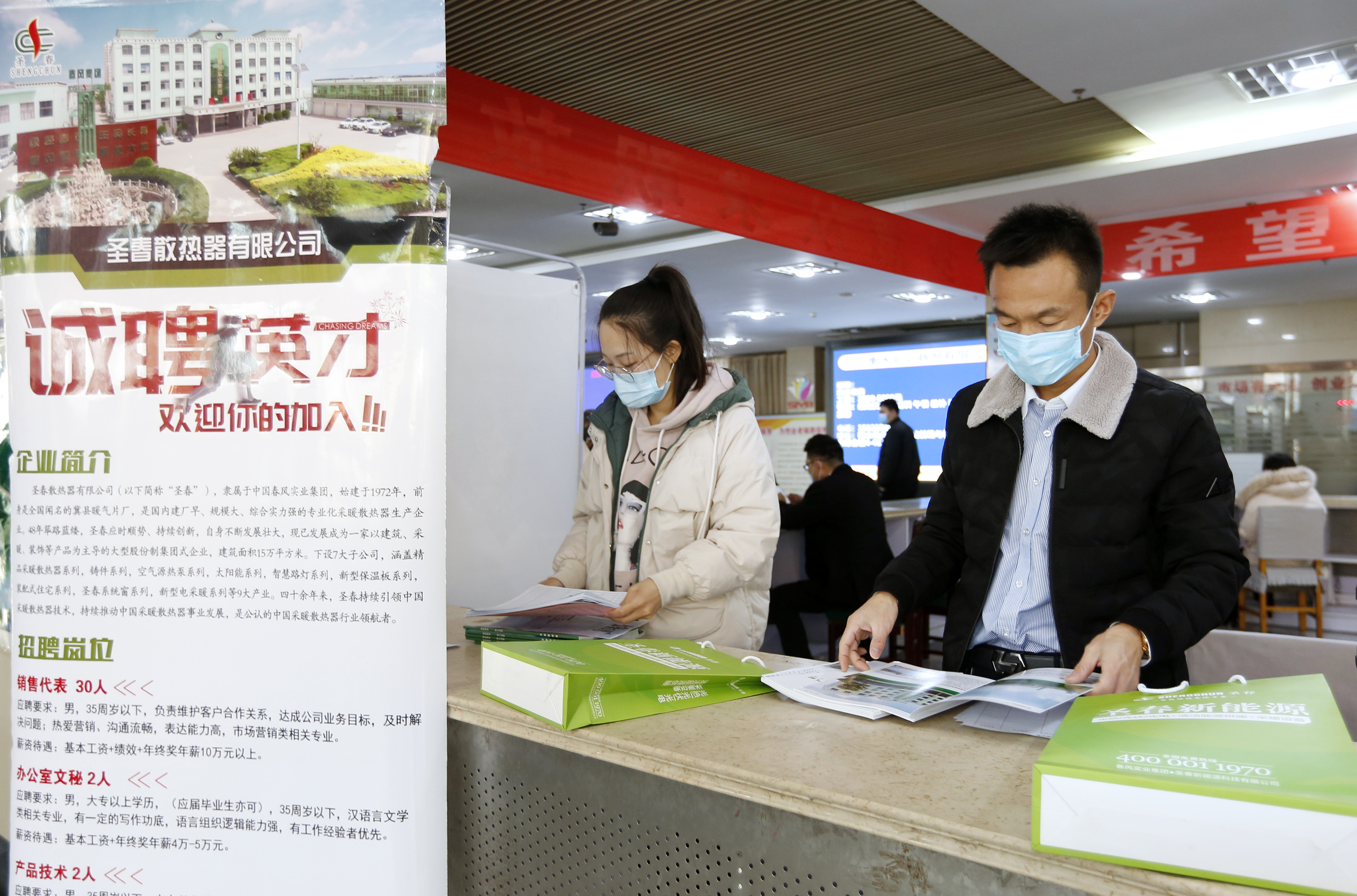 应聘者在圣春散热器有限公司展位前咨询相关岗位要求。