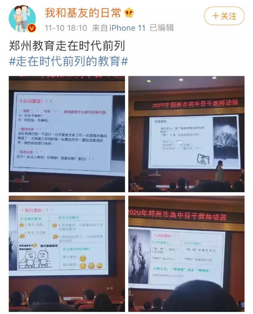 于是,正确理解并使用表情包也成为了男女老少必不可少的技能。在网上流传的2020年郑州市高中骨干教师培训会上,如何与学生聊天正式成为了培训事项,而具体内容包括:不要使用微笑、再见等表情,代之以龇牙、愉快和憨笑;表达开心时,“哈”的数量必须大于5个……