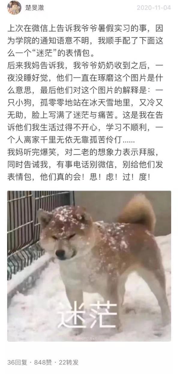 也有人在和爷爷聊天时随手配了一个“迷茫”的表情,之后才得知爷爷奶奶看到这个表情一夜没睡好觉,把孙女想象成了图片中孤零零站在冰天雪地里的小狗,操碎了心。