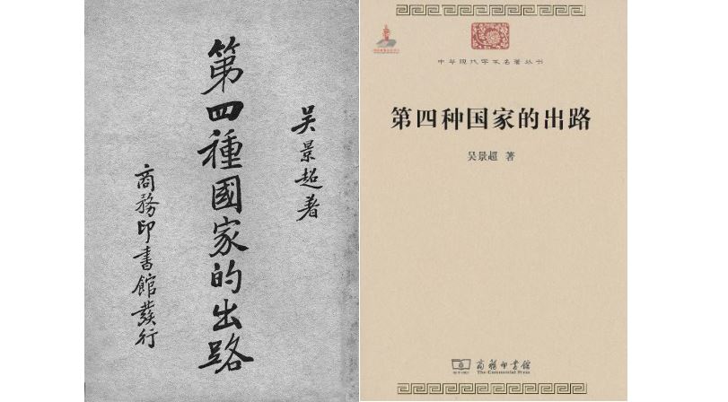 由商务印书馆发行的吴景超文集《第四种国家的出路》早期版本封面(左)。今有《第四种国家的出路》于2008年、2010年的重版(右)。
