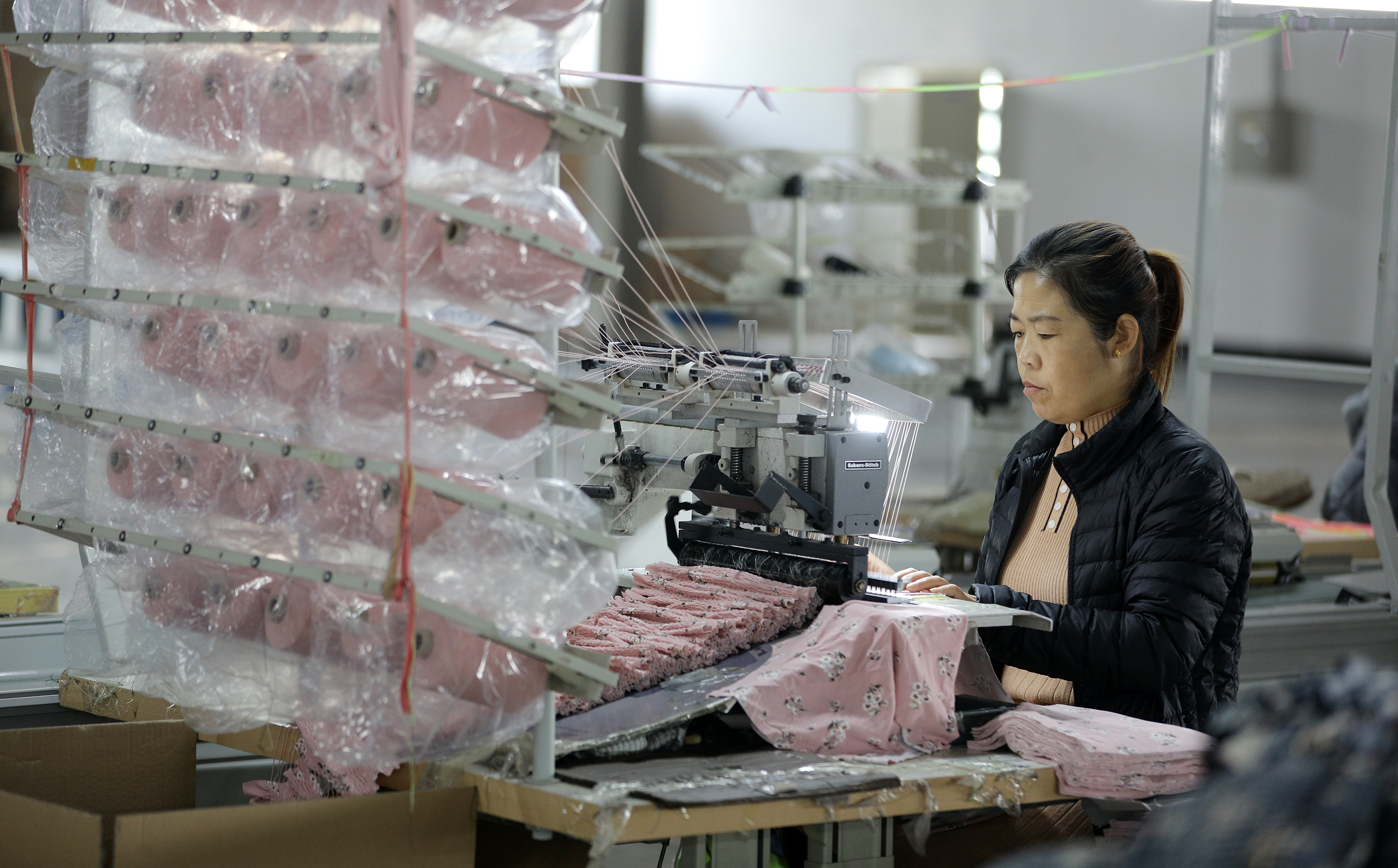 河北柯朗服饰有限公司工人正在缝制服装。