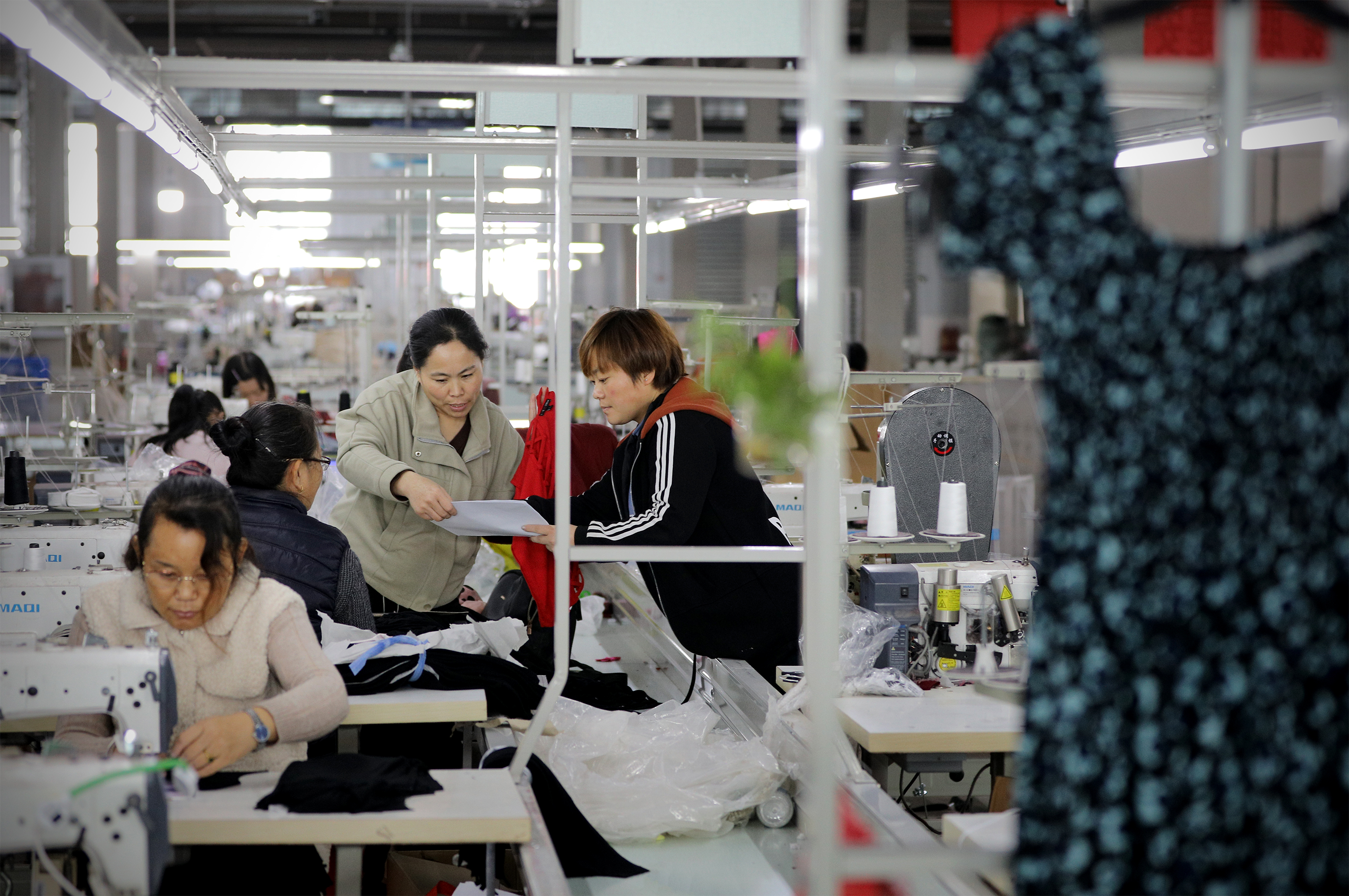 河北柯朗服饰有限公司工人正在研究缝制图。
