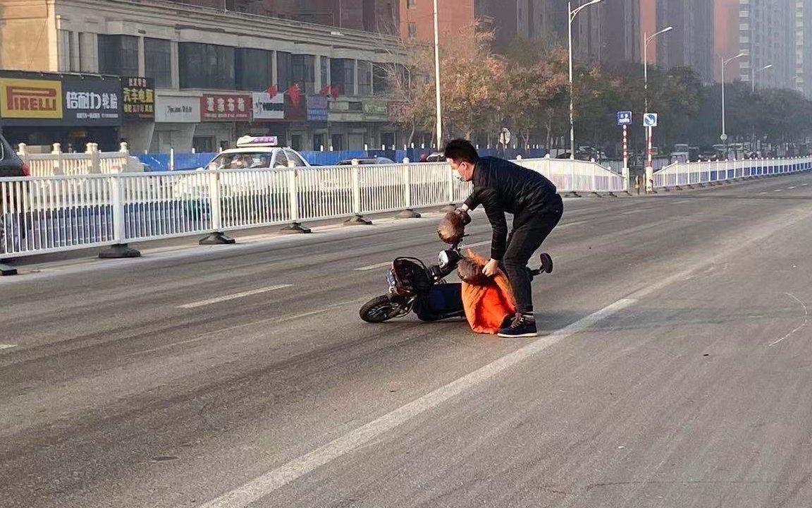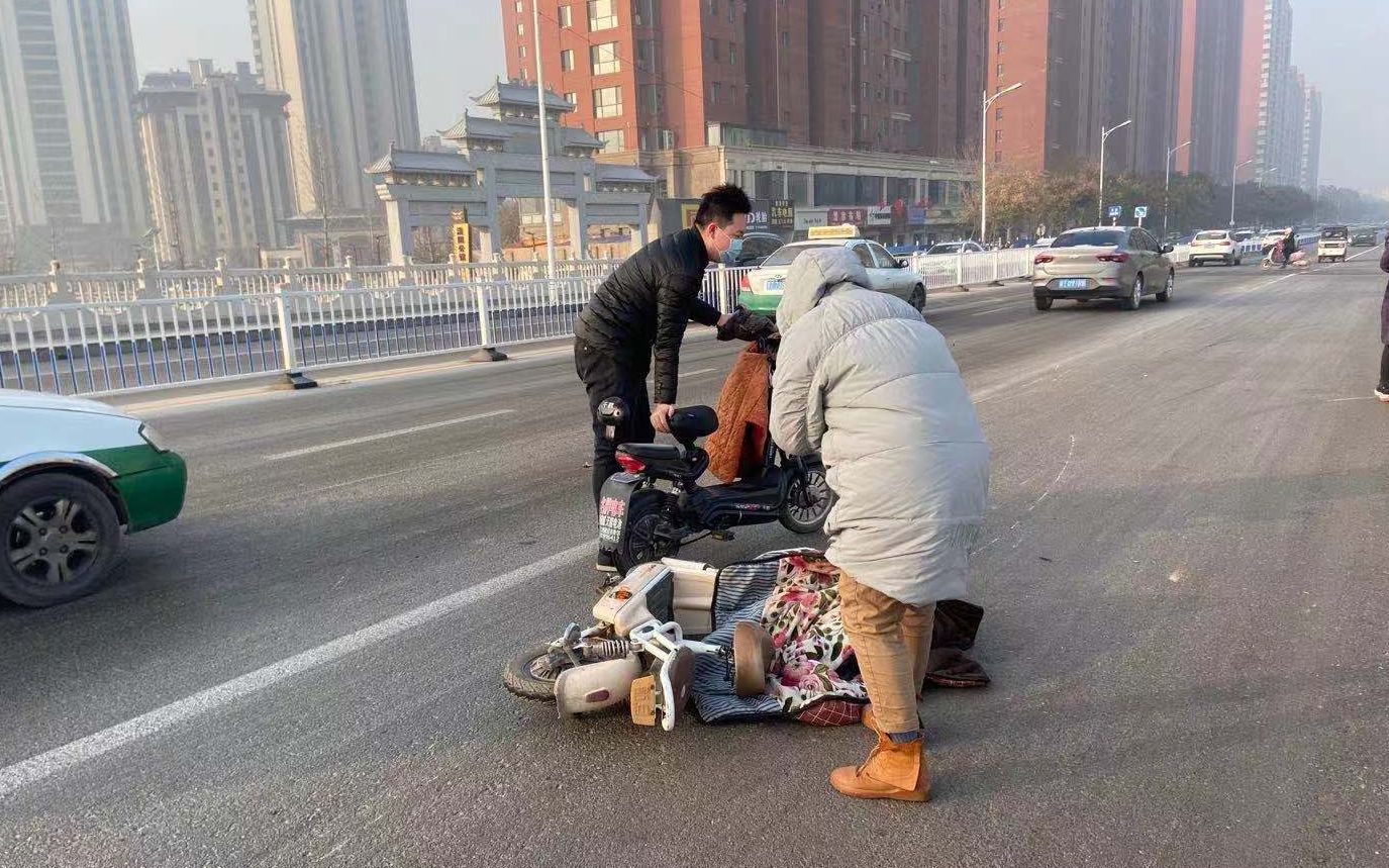 据附近环卫工介绍,一个早上看到几十辆电动车滑倒,全是因为路面结霜所致,尤其是下桥时,电动车一刹车特别容易打滑。