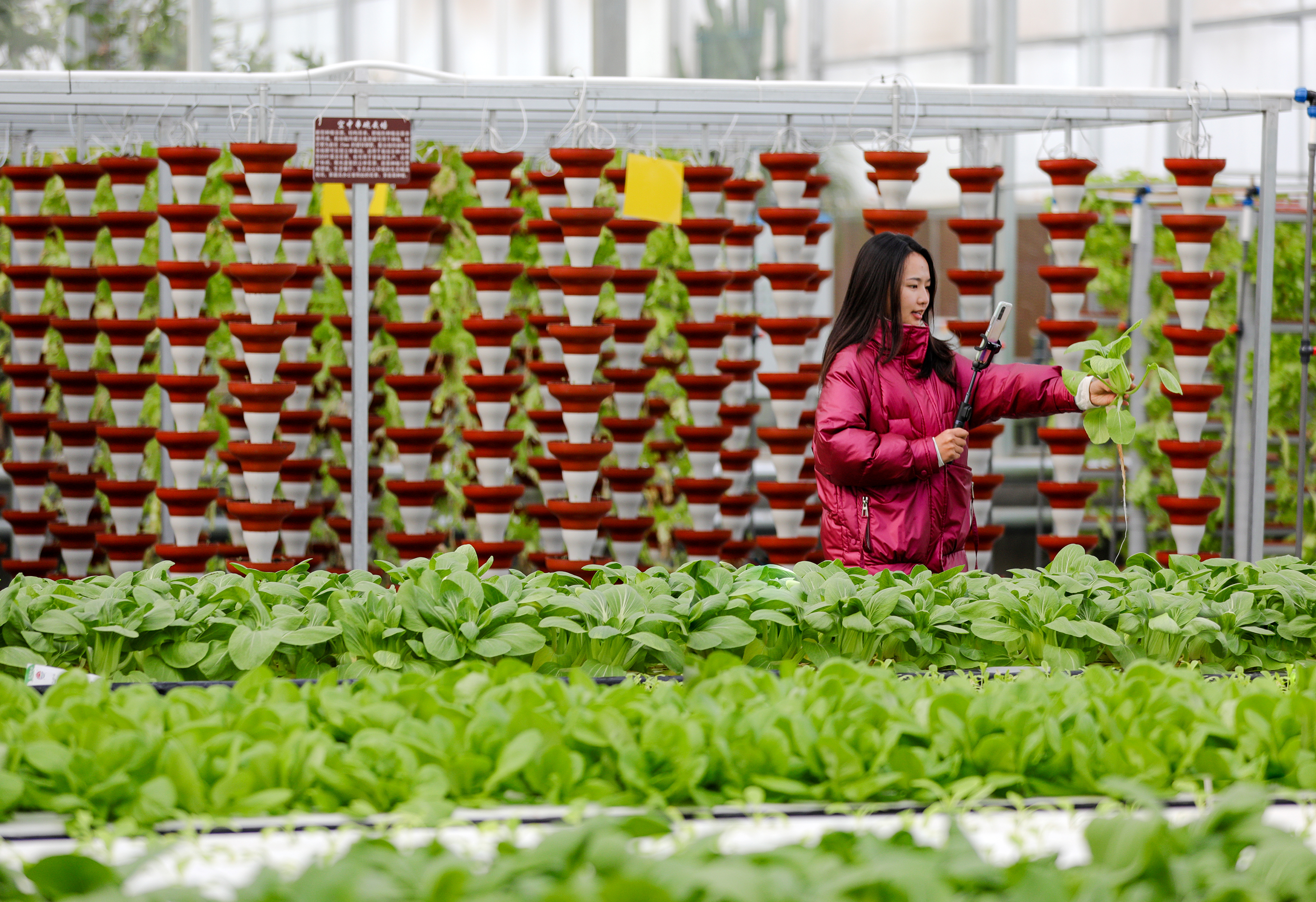 在武罗农产品种植专业合作社生态农业示范园阳光温室内,武邑县电商服务中心工作人员正在直播销售水培蔬菜。
