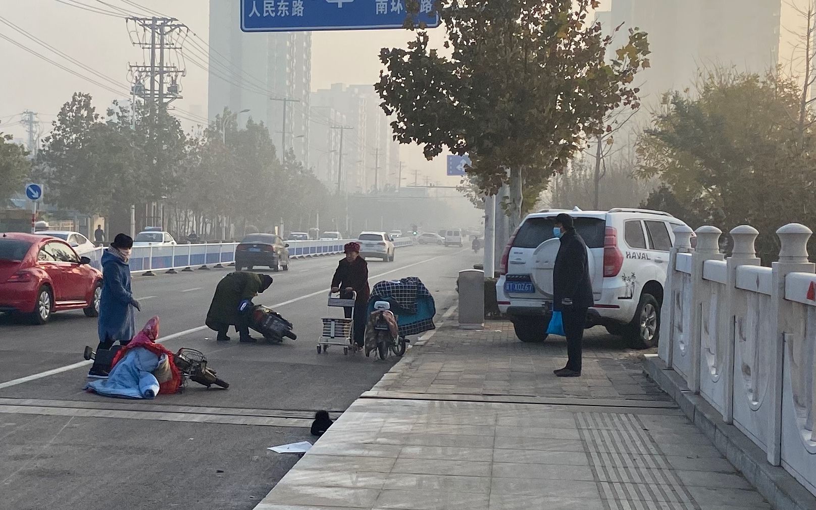 3日上午,在衡水湖大赵桥附近,因霜冻天气原因,桥面出现结冰现象,造成该路面严重湿滑,发生多起交通事故。