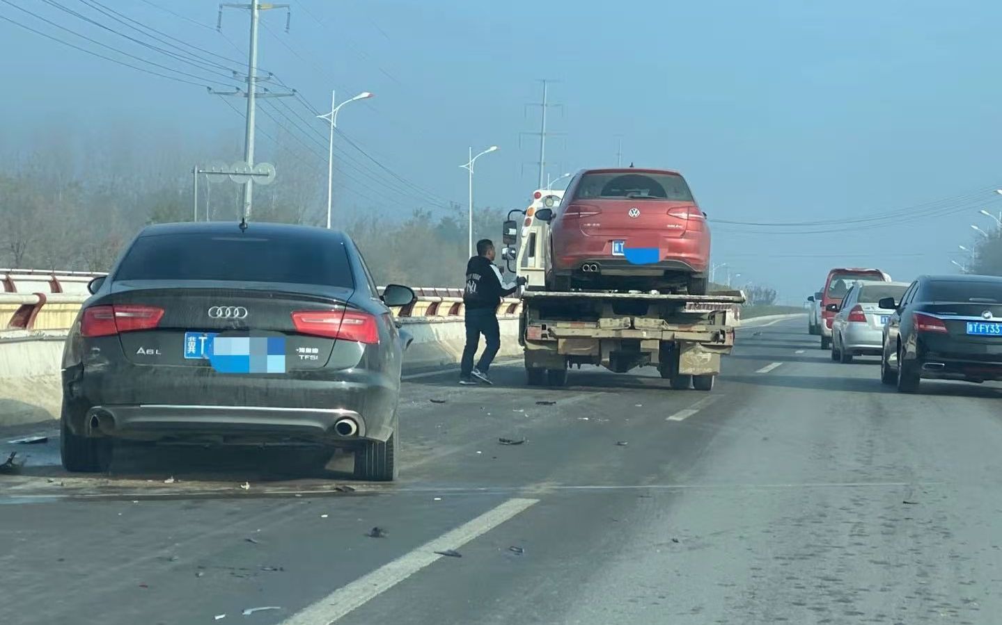 上午9时许,在东湖大道大赵桥附近,记者看到,该路段因交通事故已经造成车辆拥堵。在大赵桥上,停靠着七八辆机动车,其中一辆发生事故的红色机动车已经被拖到了托运车上,附近,一辆黑色轿车车前盖也已经撞得变形,不远处还有一辆面包车发生了侧翻,车体损伤严重。