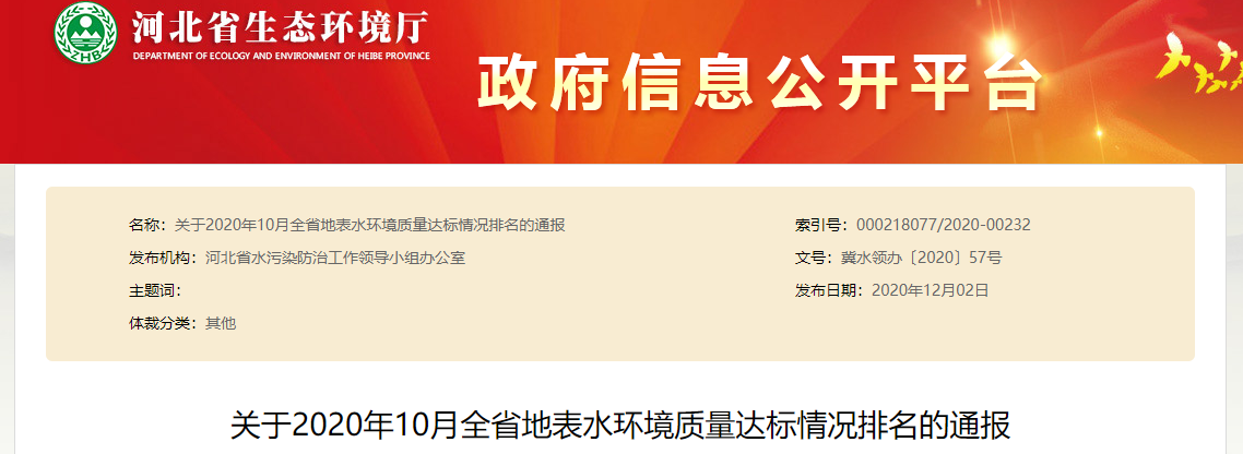 河北省水污染防治工作领导小组办公室最新发布关于2020年10月全省地表水环境质量达标情况排名的通报↓↓↓