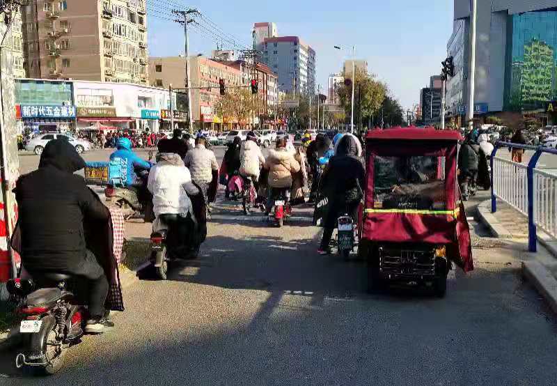 3日晚上5时30分许,新华路与中华大街交叉口东北角,由东向西,红灯亮着,在非机动车道上的骑行者们将整个通道堵死。骑自行车的人勉强从缝隙里穿插右转,而骑电动车需要右拐的行人遇到这种情况只能等。这时一名穿黑色上衣的男子骑着电动车,嘴里喊着“我要右转,借过,借过……”,但根本无济于事,没人理会他。