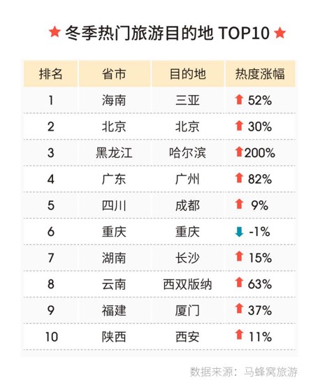 随着冬季来临,冰雪旅游、避寒旅游热度上涨。马蜂窝旅游12月9日发布的2020年冬季旅游蜂向标显示,今年冬季国内旅游热度排名前十的目的地分别是三亚、北京、哈尔滨、广州、成都、重庆、长沙、西双版纳、厦门和西安。其中,冰城哈尔滨冬季旅游热度涨幅达到200%,云南的西双版纳凭借边境村寨的民俗风情吸引了大批游客,旅游热度上涨63%。