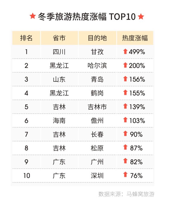 相比以往的冬季旅游,今年冬季旅游变化最明显的是国内众多小众目的地走红。马蜂窝旅游大数据显示,上榜马蜂窝旅游“中国新秘境”榜单的四川甘孜、海南儋州、吉林松原、广东茂名和珠海等目的地,旅游热度均在今年冬季迅速上涨。