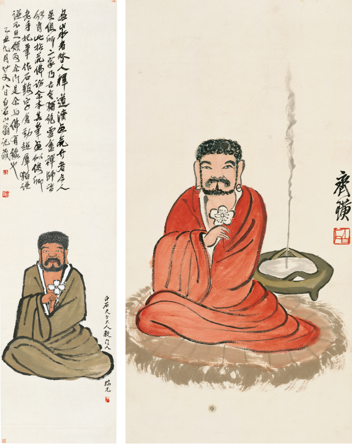 左图:瑞光《临白石画佛》,1925年。北京画院藏。右图:齐白石《拈花微笑》,无年款。北京画院藏。