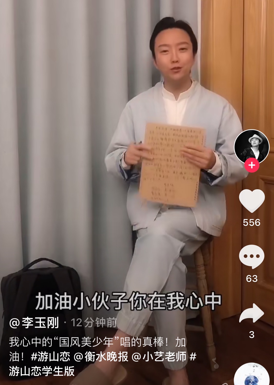 10日晚,衡水日报社全媒体平台通过衡水晚报抖音号发布了“衡水饶阳五年级学生音乐课戏腔唱《游山恋》”的短视频。李玉刚观看视频后格外称赞,并于11日晚在抖音平台上@衡水晚报抖音号,称小男孩在他心中是“真正的国风美少年”。