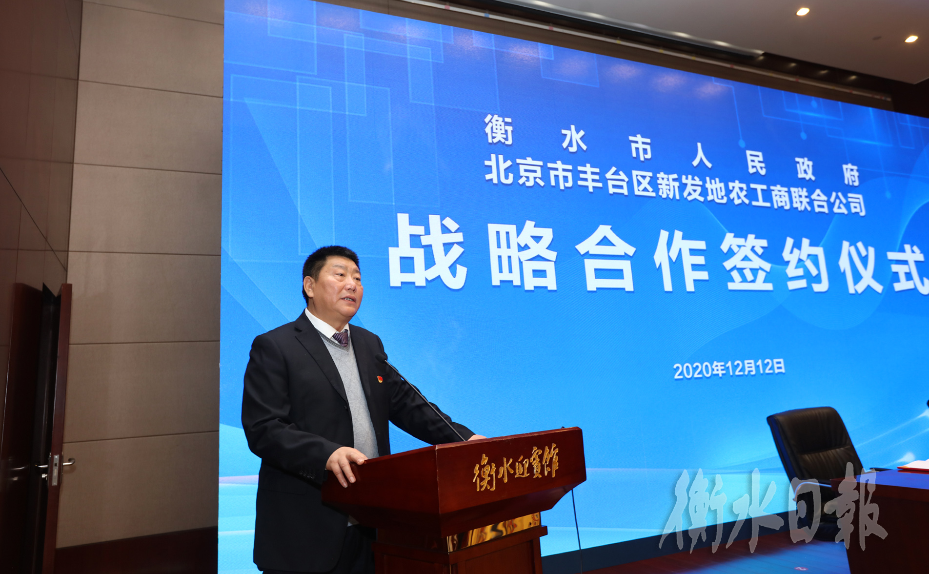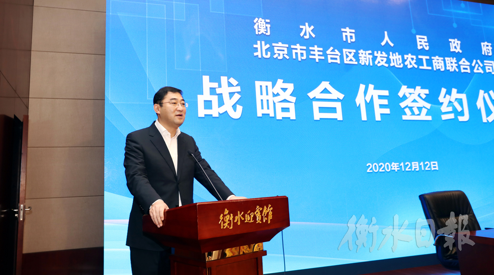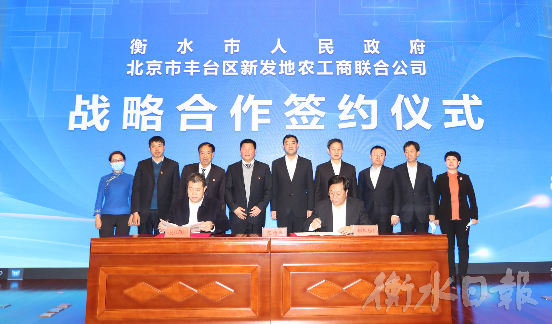 12月12日,衡水市与北京新发地集团签署战略合作协议。衡水市委书记赵革出席签约仪式并致辞。衡水市市长吴晓华、北京市丰台区花乡党委书记王世义、北京市丰台区花乡政府副乡长杨继军、北京新发地农产品批发市场董事长张玉玺、《中国扶贫》杂志社总编文炜、北京衡水商会会长骆爱国以及北京新发地10位单品销售大王、经营大户等出席签约仪式。衡水市委副书记邸义主持签约仪式。衡水市副市长刘玉华代表市政府与北京市丰台区新发地农工商联合公司签订战略合作协议。