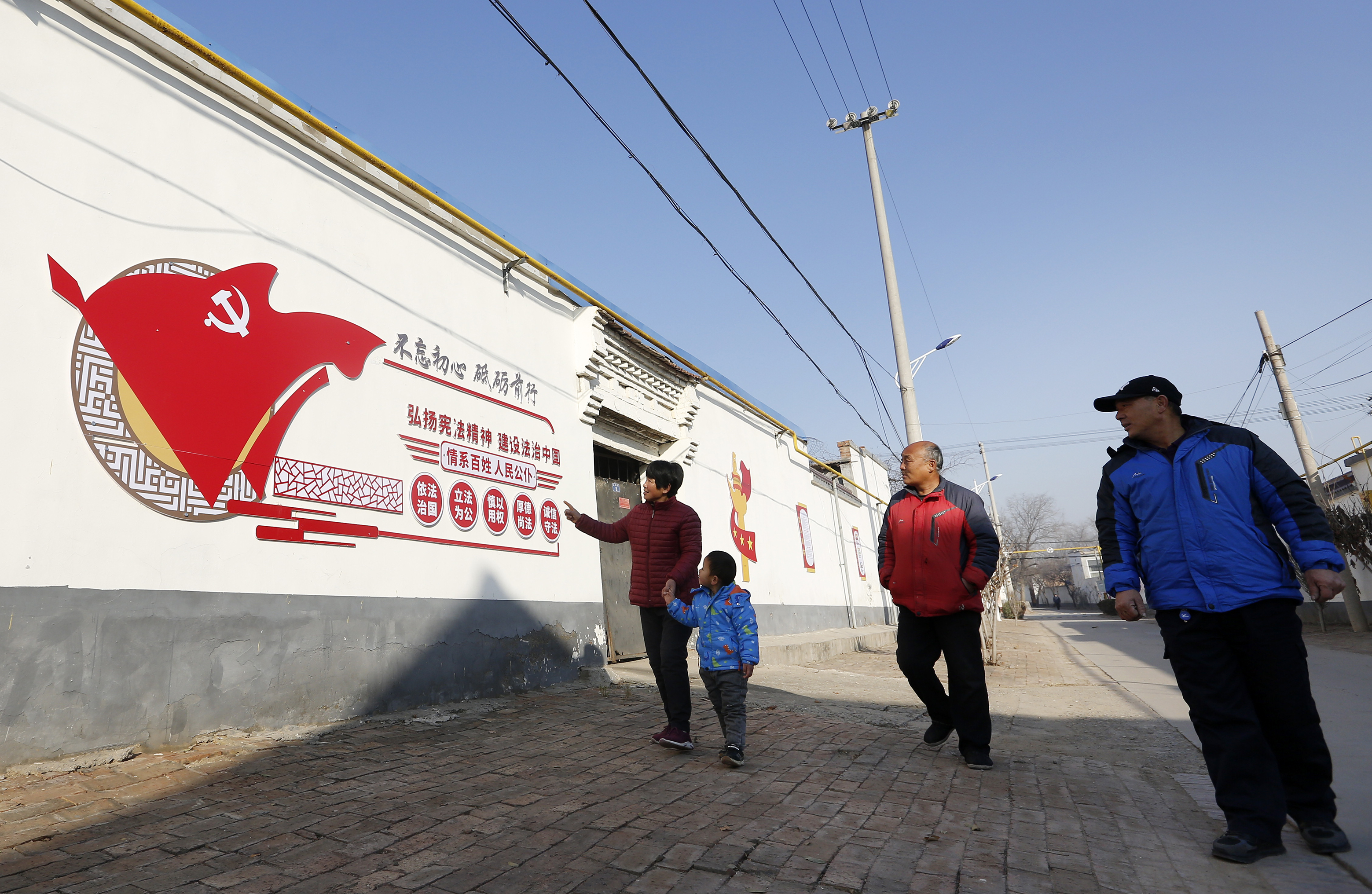 桃城区赵家圈镇前铺村村民驻足观看文化墙。