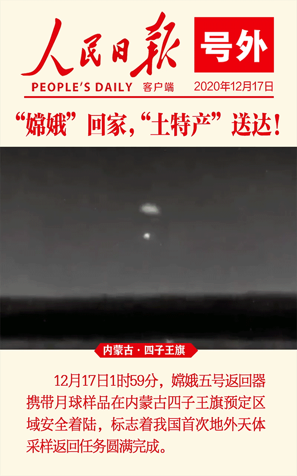 北京时间17日凌晨,在白雪皑皑的内蒙古四子王旗,嫦娥五号携月球样本岩石和土壤返回地球。这是中国航天史上一次满载而归的科学探索,也是人类太空探索中一段智慧与勇气兼备的华彩乐章。