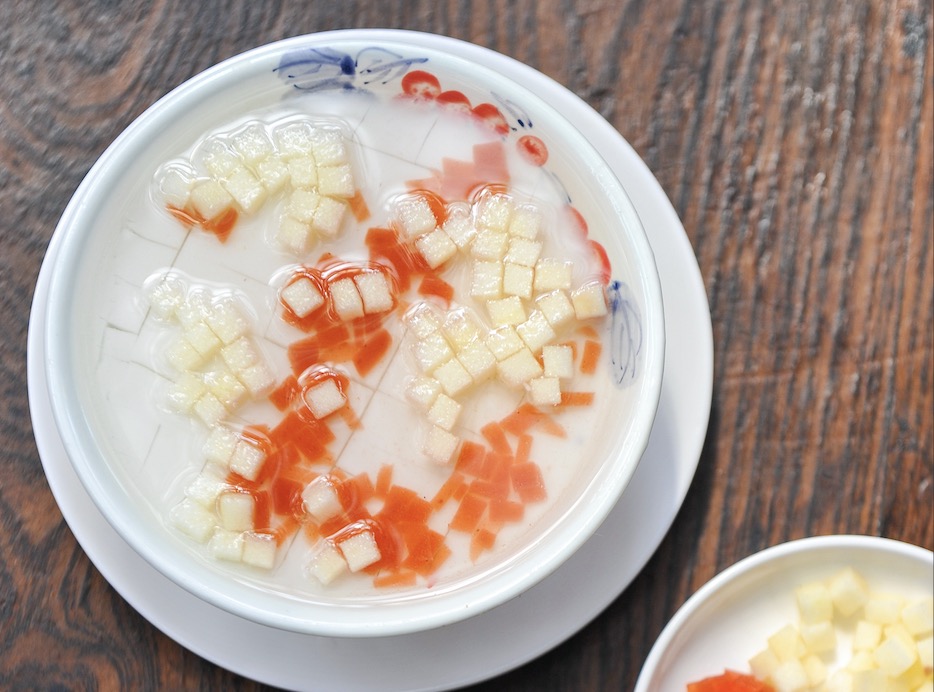 杏仁豆腐是江浙地区的一道著名甜点,制作方法是将甜杏仁磨成浆,加入琼脂、牛奶等材料,煮沸后过滤,再冷冻切块。在家庭制作的杏仁豆腐中,为了丰富口感,不少人还会根据喜好加入果汁、水果罐头等食材。