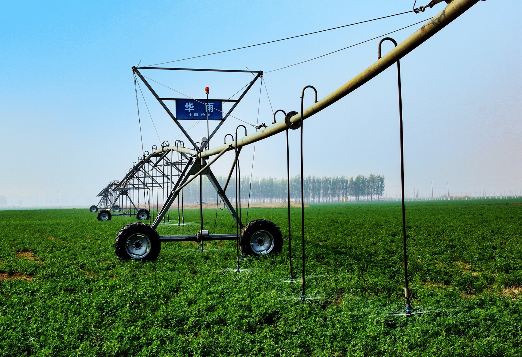农田中,现代化喷灌车正在作业。(资料图)武强县摄影家协会供图