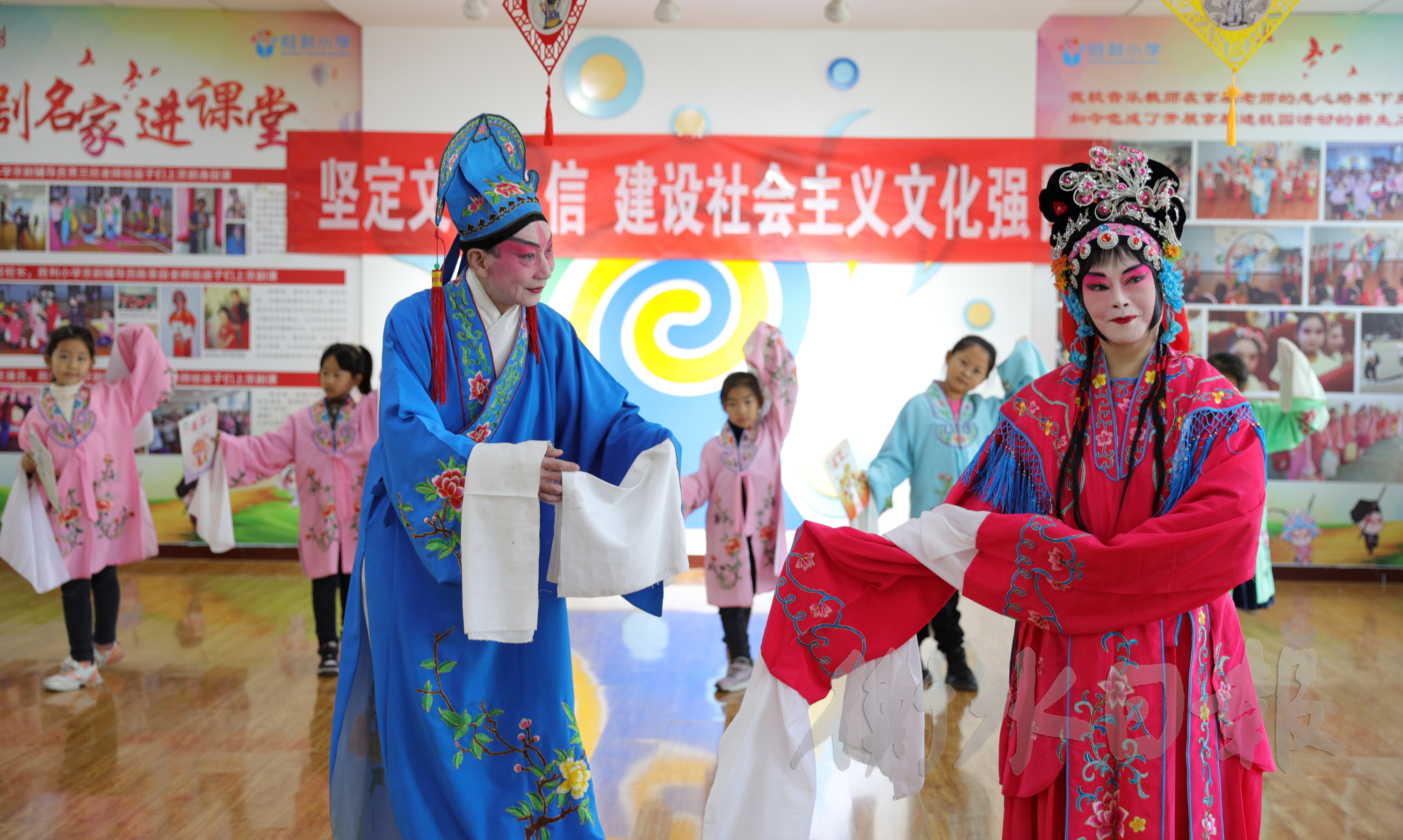 在胜利小学音乐舞蹈室,为了让孩子们全面感受京剧氛围,陈荣段打算来一次带妆排练。给孩子们逐一穿上戏服后,应邀前来的朋友帮陈荣段一起画妆。妆容初现,孩子们围着她,有的露出笑容,有的目不转睛……在另外一间教室,肖世明给学生们悉心指导着小生形体动作。
