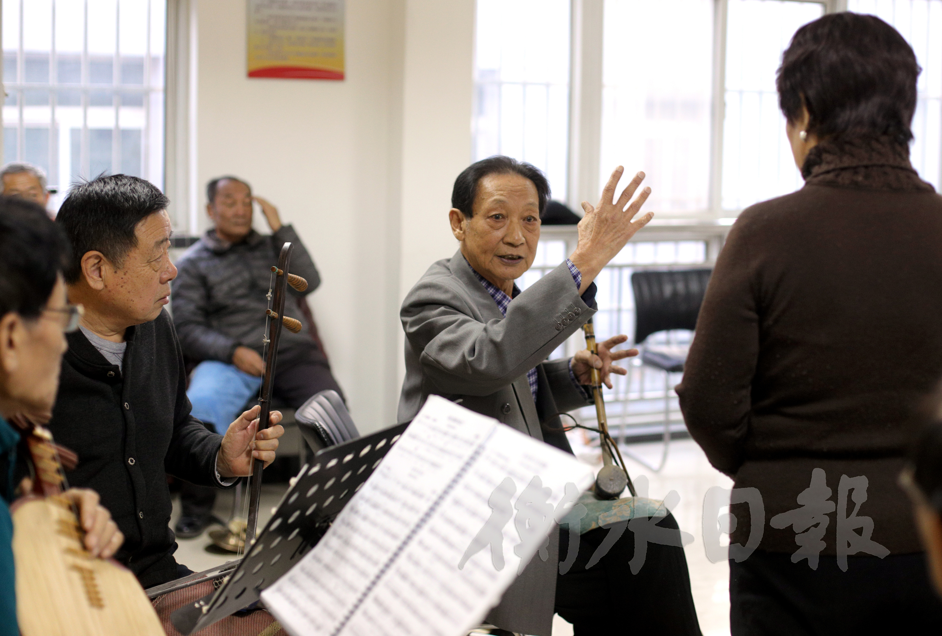 肖世明在给社区京剧社的成员们进行指导。