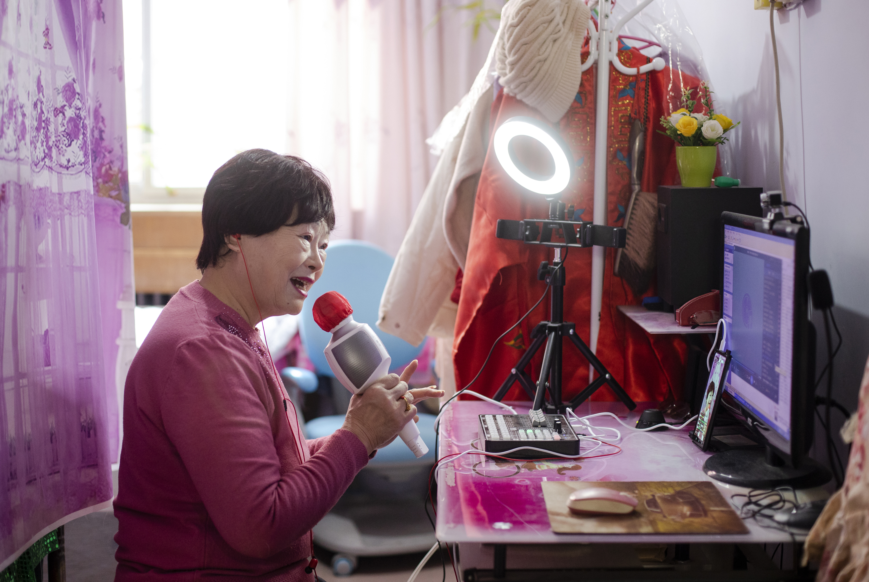 陈荣段正在直播平台上为网友唱戏。