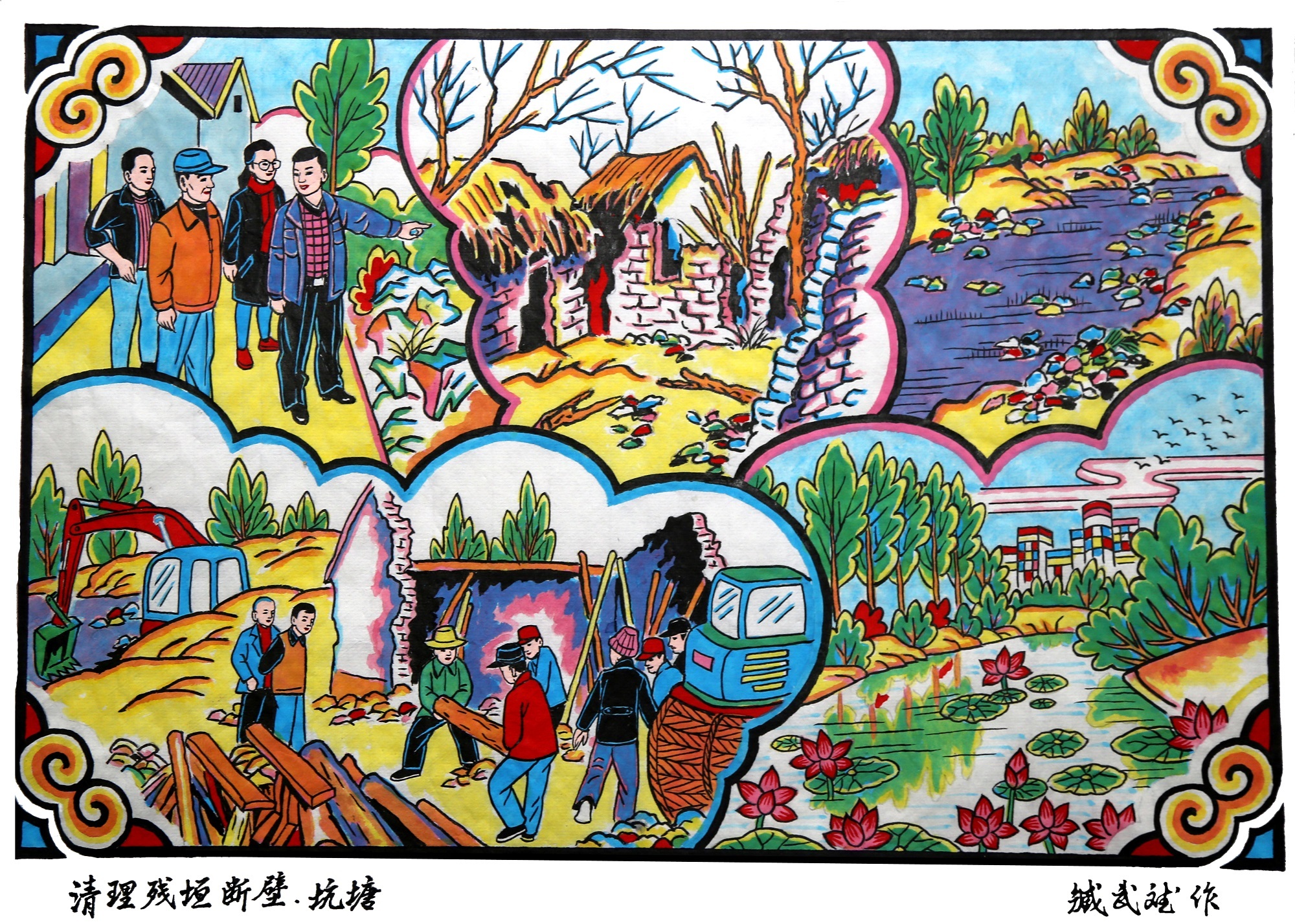 武强年画艺人创作的新年画作品《清理残垣断壁、坑塘》。武强县委宣传部供图