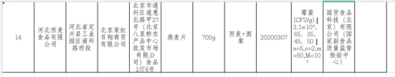 抽检公告显示,标称河北西麦食品有限公司生产的“西麦”燕麦片(700g,2020/3/7),霉菌项目的5次检测结果分别为210CFU/g、65CFU/g、35CFU/g、 45CFU/g、50CFU/g,而《绿色食品 麦类制品》(NY/T 1510)规定,同批次5个独立包装产品中霉菌检测结果不得超过100 CFU/g,且至少3个包装产品检测结果不超过50 CFU/g。