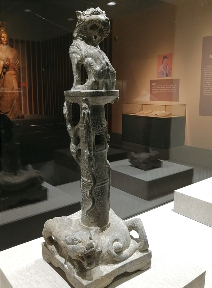 熨斗架底部为一正方形, 矩形足, 底上浮雕一兽,兽首卷曲,瞠目张口,四肢用力作撑起状,背部承托一圆柱状架体, 架体圆柱上浮雕四只昂首垂尾的虎形兽。四兽用吻部承托柱顶的圆形盘, 盘上浮雕一虎形兽, 该兽前足直立,两耳竖起,利齿裸露, 回首做蹲坐状。圆柱中上部雕有一虎头, 张口, 口略呈长方形, 虎口穿透柱径。虎口下唇阴刻胡须。圆柱通体饰波浪纹、锯齿纹、凸弦纹,通高63 厘米,底座边长20.5 厘米。馆藏一级文物。