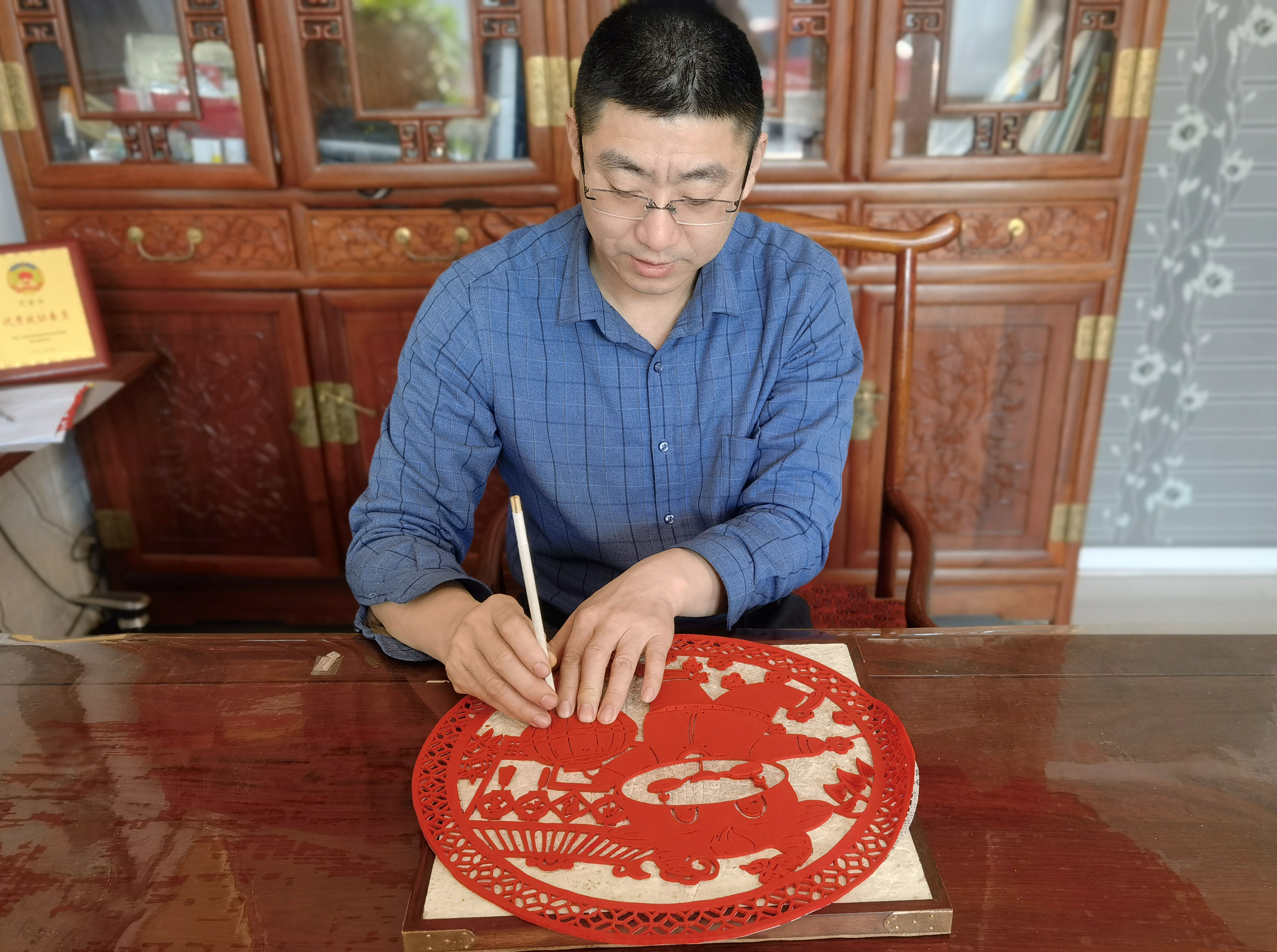 阜城县剪纸艺人尤金水在剪刻牛年年俗剪纸。