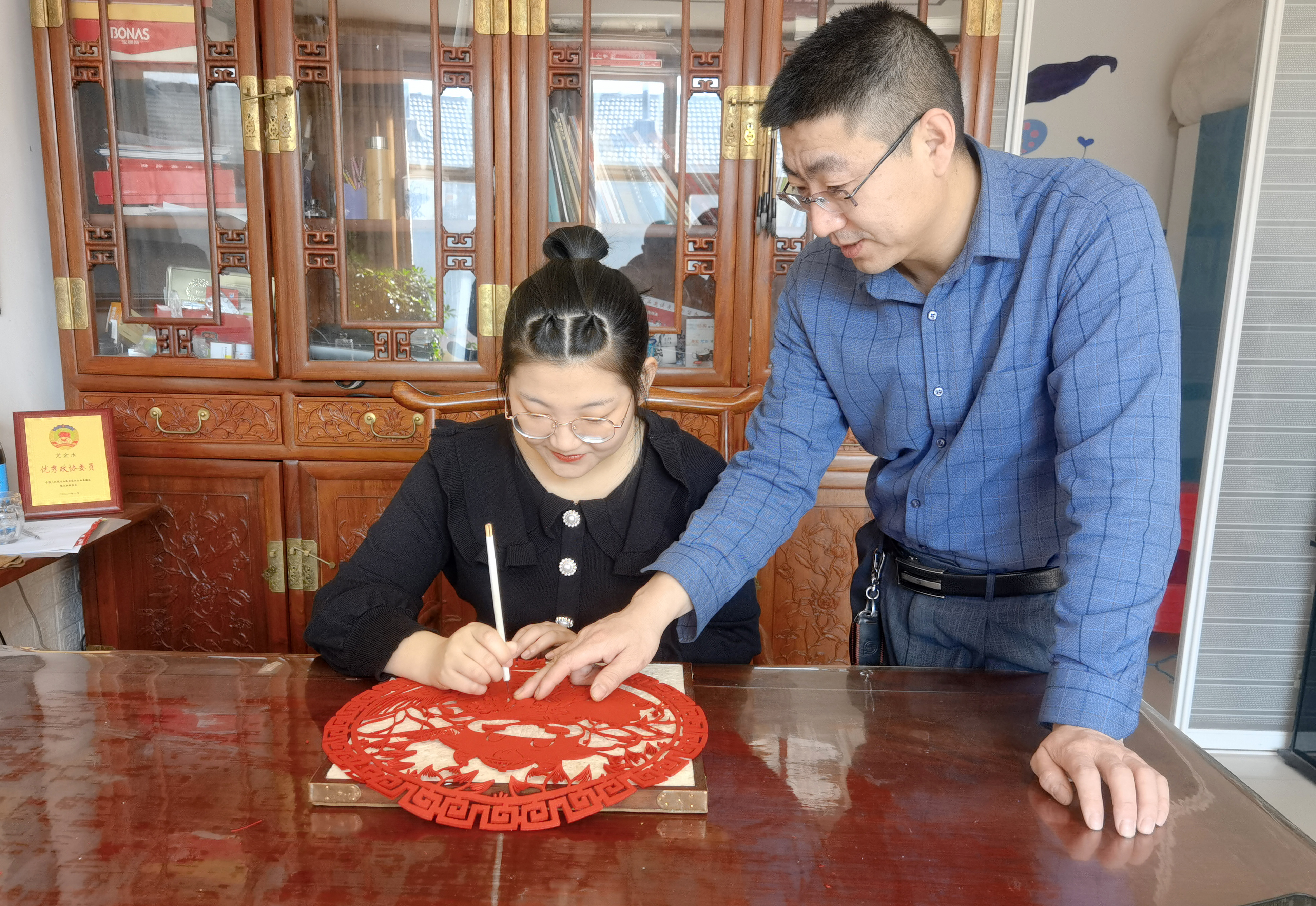 阜城县剪纸艺人尤金水在指导年轻人学习剪纸。