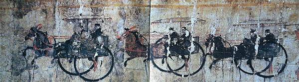 墓室内的壁画,集中于中室、前南侧室和中南侧室,反映了墓主人生前仕途和生活的主要情景。中室壁画于四壁用黄色格线由上至下分为四层,表现墓主人的四次出行,象征墓主人的四次升迁或值得纪念的事情。四次出行图中共有马匹176匹,随从272人,车辆八十二辆。在汉代,马是出行的重要部分,象征威严、权贵,出行时马的数量可以显示出主人的身份地位,根据《后汉书•舆服志》的记载,像这种出行仪仗,官员级别应在二千石以上,二千石在当时地方的行政官员中是最高官级。