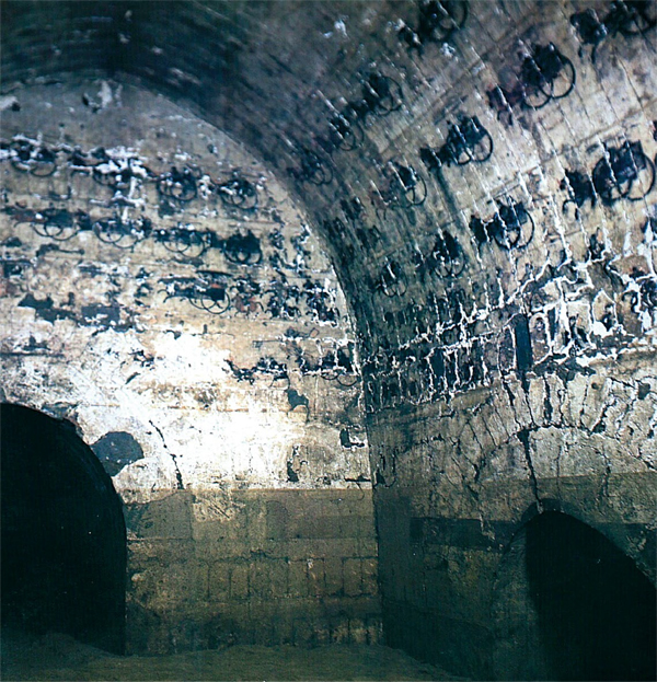 前南侧室内壁画主要表现下属官吏治事和伍伯侍卫的情景。中南侧室内壁画描绘墓主人坐于帐内,后有侍女,右有男侍和伎乐,左有属吏谒见的情景。北壁画一幅建筑图是按照墓主人生前所占有居室情况画的一幅规模宏大、庭院错落的鸟瞰图。它的构成为一大四合院里套着许多小四合院,大门和中门之内是一个“日”字形的两进四合院,以该院为中心,绕其左右和后部,均有许多庭院。后排中间一个大院内,设有一座五层的方柱形瞭望楼,楼顶为庑殿式,顶层周围有栏杆,右侧后部有一测风旗,杆顶有一向风鸟,前部置一扁圆形报警用鼓,楼的中间三层均有方形射孔。从建筑风格来分析,四合院在东汉时期就成为北方民居的显著特征,同时方正、对称等建筑理念也得到充分体现。从测风旗和向风鸟在城堡中的应用来看,安平当时的科学技术及制造业已相当发达,这也是向风鸟早在东汉就被用在建筑上的一个有力佐证。从瞭望楼及报警鼓、射孔的设置来看,东汉末年政局动荡、战乱频仍可见一斑。