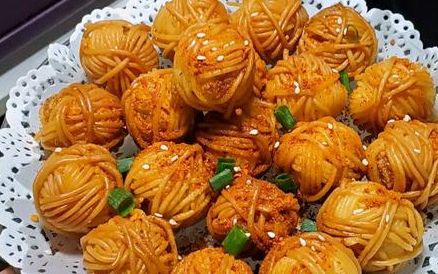3. 锅中烧油,约5分热时放入“鹌鹑团”,小火炸熟面条且炸制金黄酥脆即可捞出。