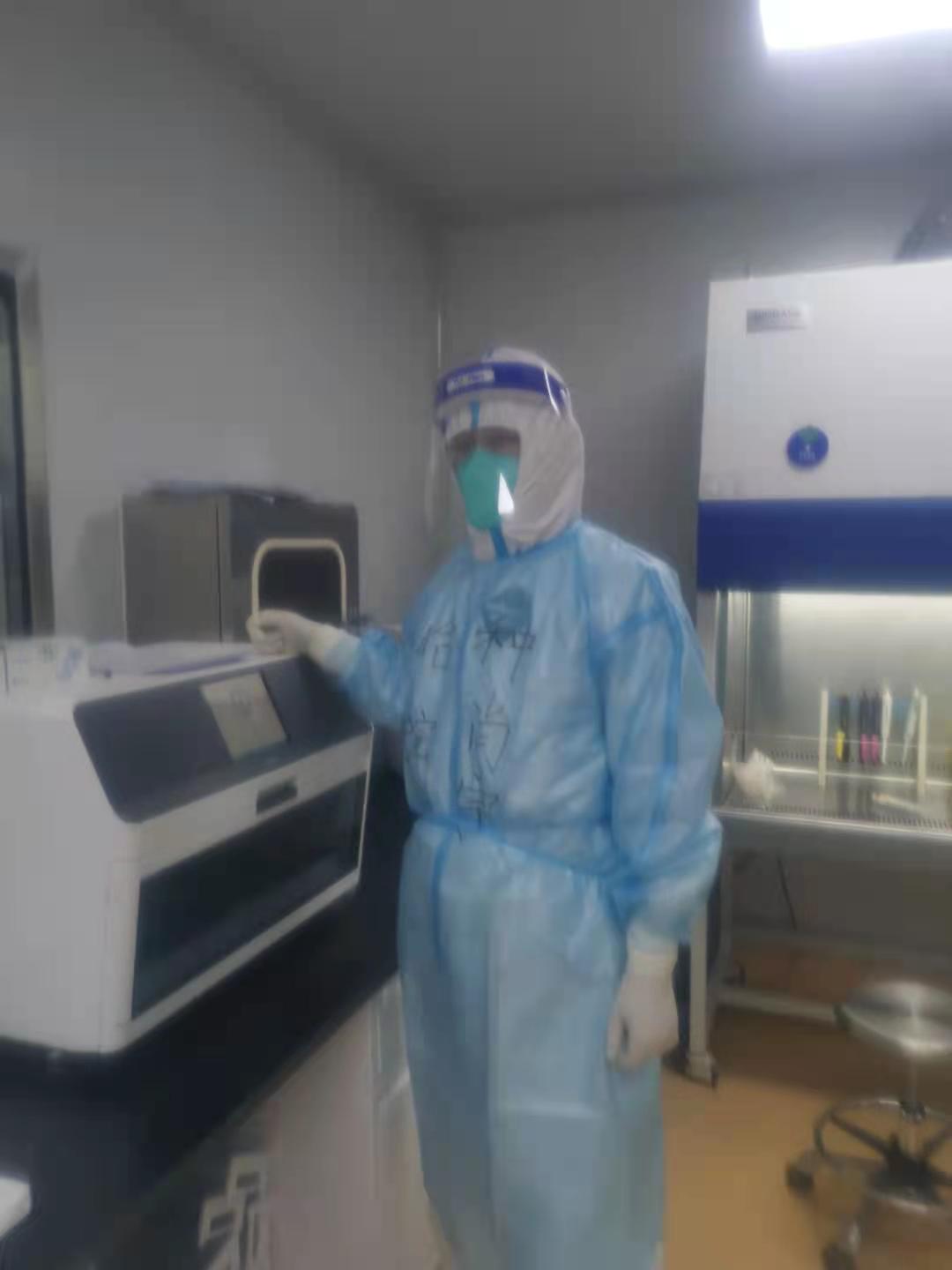 对张长庚主任的这番见解,种肖宇是心悦诚服的。他说,“我是党员我先上,这是战‘疫’的时代最强音。置身在哈院这样具有光荣革命传统的先进集体,有科室团队的良好熏染,我必定尽自己所能,让防控疫情斗争一线扬起哈院的青春旗帜!”1月26日上午,作为衡水紧急支援石家庄核酸检测任务的一员,种肖宇奔赴河北医科大学第一医院支援当地全员核酸检测工作。“河北医科大学第一医院检验中心,系国家公共检测实验室,肩负着藁城区、裕华区、新乐市、平山县等地的样本检测,24小时连轴运转。白天采集的咽拭子送到时,差不多是晚上了。因为任务紧急,必要时不得不通宵工作。只要在岗,我们每个人必定是汗流浃背。但大家都鼓足了干劲,盼着早点儿战胜疫情!”种肖宇胸有成竹地说,提取、加样、PCR扩增、结果分析,每一个工作步骤都关系到核酸检测的质量和安全性,每一次与样本的接触都面临着被感染的高风险。穿着三层防护服、戴着护目镜、手套、靴套,每一分、每一秒都是对体力和耐力的巨大消耗,很快就会感到缺氧憋闷,这难免造成情绪上的波动。对此,种肖宇非常淡定地说,“这就要葆有心态上的积极乐观。因平日训练有素,一进入岗位便忘我地投入进来,很快就适应了工作节奏。”因为每次实验需要3到4人的密切配合才能完成,试验前后要对环境进行清洁和全方位消毒,部分实验用品和医疗垃圾进行分批次消毒灭菌。种肖宇时刻冲在前、干在前,专捡着累活干,他用主动担当,为这个来自各地的团队带来着和谐和高效。