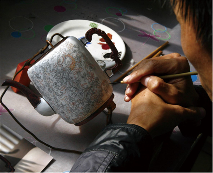 铜胎画珐琅又称“烧瓷”,目前,河北省衡水市景县龙华镇是铜胎画珐琅技艺传承制作的中心区域,以龙华镇为中心,其技艺影响,直接辐射到县域及衡水市周边地区。铜胎画珐琅,它以红铜制胎,后在胎土敷一层白釉,烧结后用釉色彩绘,经二三次填彩、修正后再烧结、镀金、磨光而成。历经裁料、制胎、敷釉、烧结、彩绘、烧彩、抛光、镀金等多达几十道工序。因其工艺近似景泰蓝,在装饰上又有瓷器的风貌,所以成品既具有景泰蓝厚重、端庄的特色,又有瓷器明丽、清雅的风采,从而构成了其独具一格的艺术特征,是我国民族思想、民族文化的良好载体,具有很高的艺术文化价值。