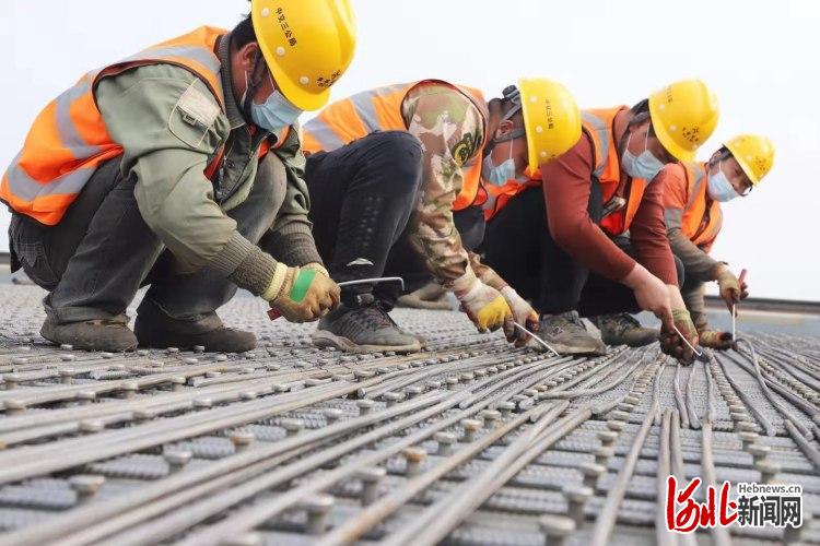 3月16日,在京雄高速河北段白沟河特大桥建设现场,随处可见埋头苦干的身影。运输钢筋材料、进行栓钉焊接、绑扎钢筋网……320余名施工人员聚力攻坚,桥面混凝土铺装作业顺利进行。