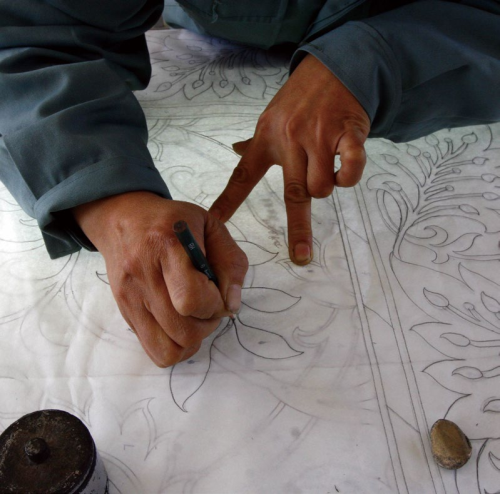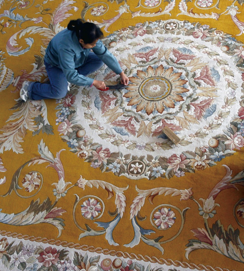 地毯的织做方式花样繁多,其成形和后序处理也非常复杂。一块地毯要经过:选料、图案、染线、合线、捞线、织作、半修、平毯、扫边、片毯、洗毯、清投、整理 13 道大工序和 86 道小工序,通过精工细作才能完成。其中地毯制作的四道主要工序是图案、染线、织毯、水洗。图案设计是每块地毯的灵魂,根据用户的需求,设计彩稿、放大、描图,图案纹样文化底蕴浓厚,丰富多彩,艺术风格多样。传统图案的主要代表纹样有八吉祥、四艺、龙凤等;现代图案代表纹样有山水、风景及抽象、模糊印象。经过不同颜色丝毛的交织,在深沉、典雅的图形上各具风姿,或素雅清秀,或古色古香。染线主要采用同媒染色法、后媒染色法和快速着色法进行环染和段染,坚牢色艳,工艺繁杂。织毯是地毯的成形工序,决定着整块地毯的内在质量,即根据图案纹样的要求采取多种形式编织技法,掌握“平、顺、短、齐、地”织作要领,毯面平整形象逼真,毯基挺实或柔软,经久耐用。水洗是将绿色环保洗涤液剂溶解水,经水洗和多遍次顺洗、呛刮,将地毯表面绒头打开,产生光泽和质感,使毯面弹性强、色泽艳、手感绵软、洁净、光亮。