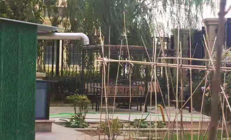 5月24日下午,记者在业主的引领下来到绿城·诚园小区内部,在东侧5号楼楼下发现,一大片土地被铁栅栏圈起来,里面有十余块菜畦,有的已长出了长长的菜叶,有的才钻出新芽。另外,紧邻楼体处还搭建起一座小轻钢房,伸出烟囱。业主蒋女士说:“这片地方应该是公共用地,不知道什么时候成了私人菜园。原本设在小区内部的公共摇椅竟然也被搬进这里,成了私人设施。”