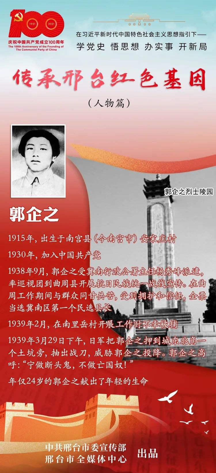 郭企之,15岁加入中国共产党,23岁当选冀南区第一个民选县长,24岁受伤被捕。敌人软硬兼施,他宁死不屈,壮烈牺牲。