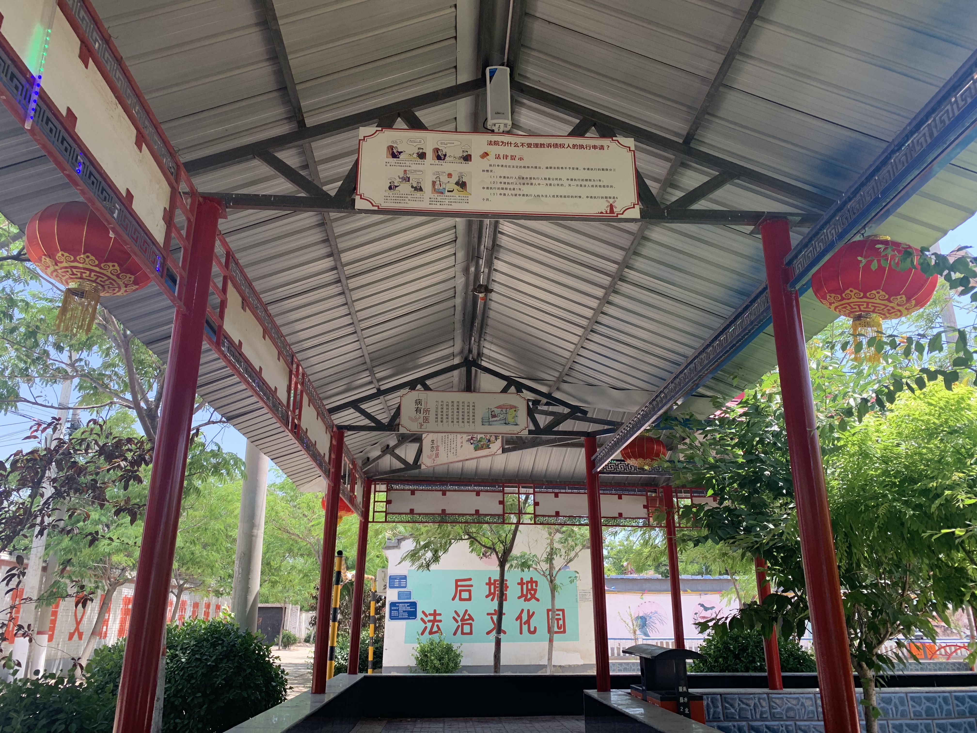 月季花、木槿花、银杏树……走进后塘坡村正中心的小花园,一股夏天的气息扑面而来。坐在凉亭上,一边听着轻音乐,一边在文化长廊中学习法律知识,尽情享受着新农村的宜居生活。