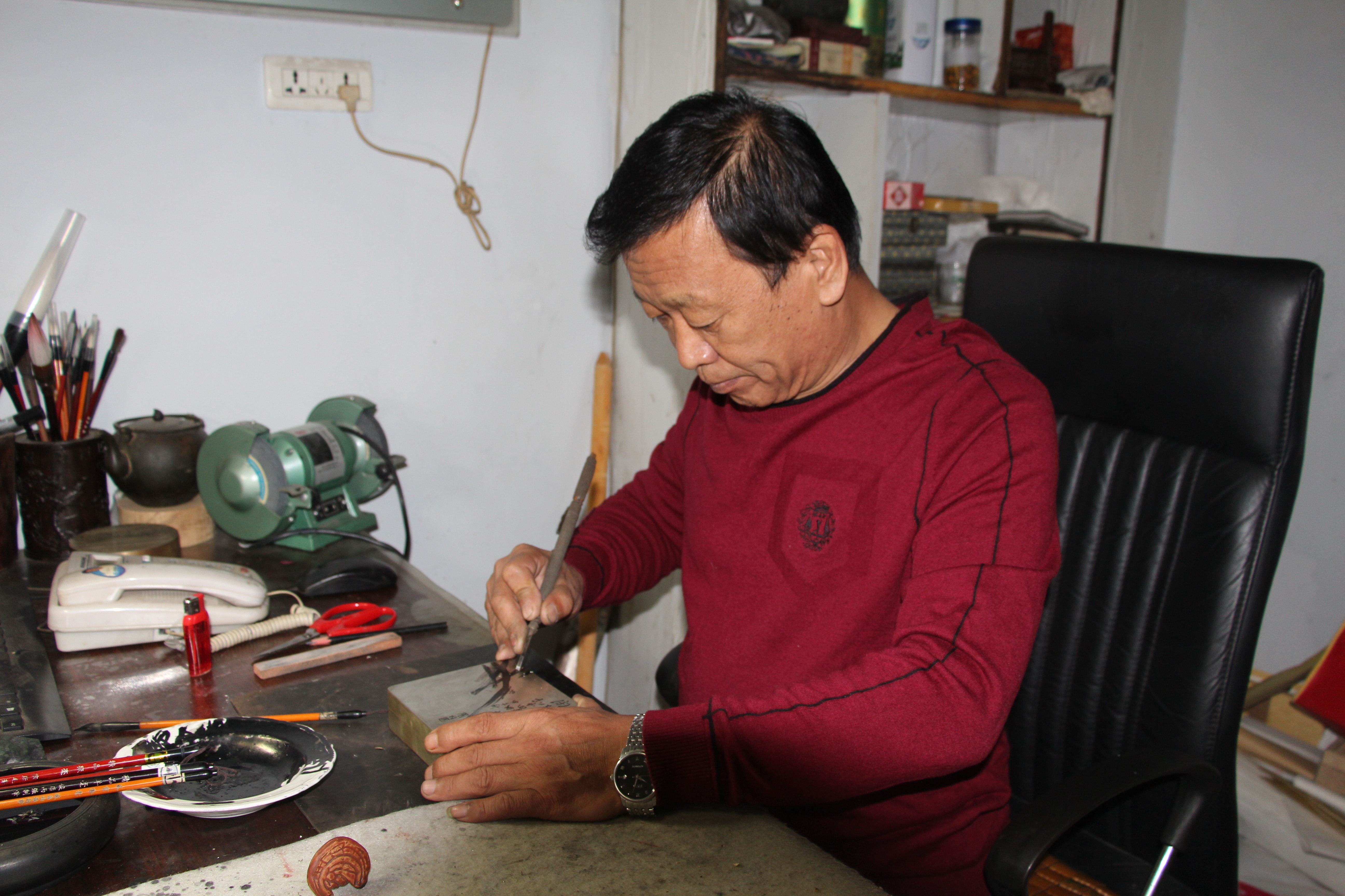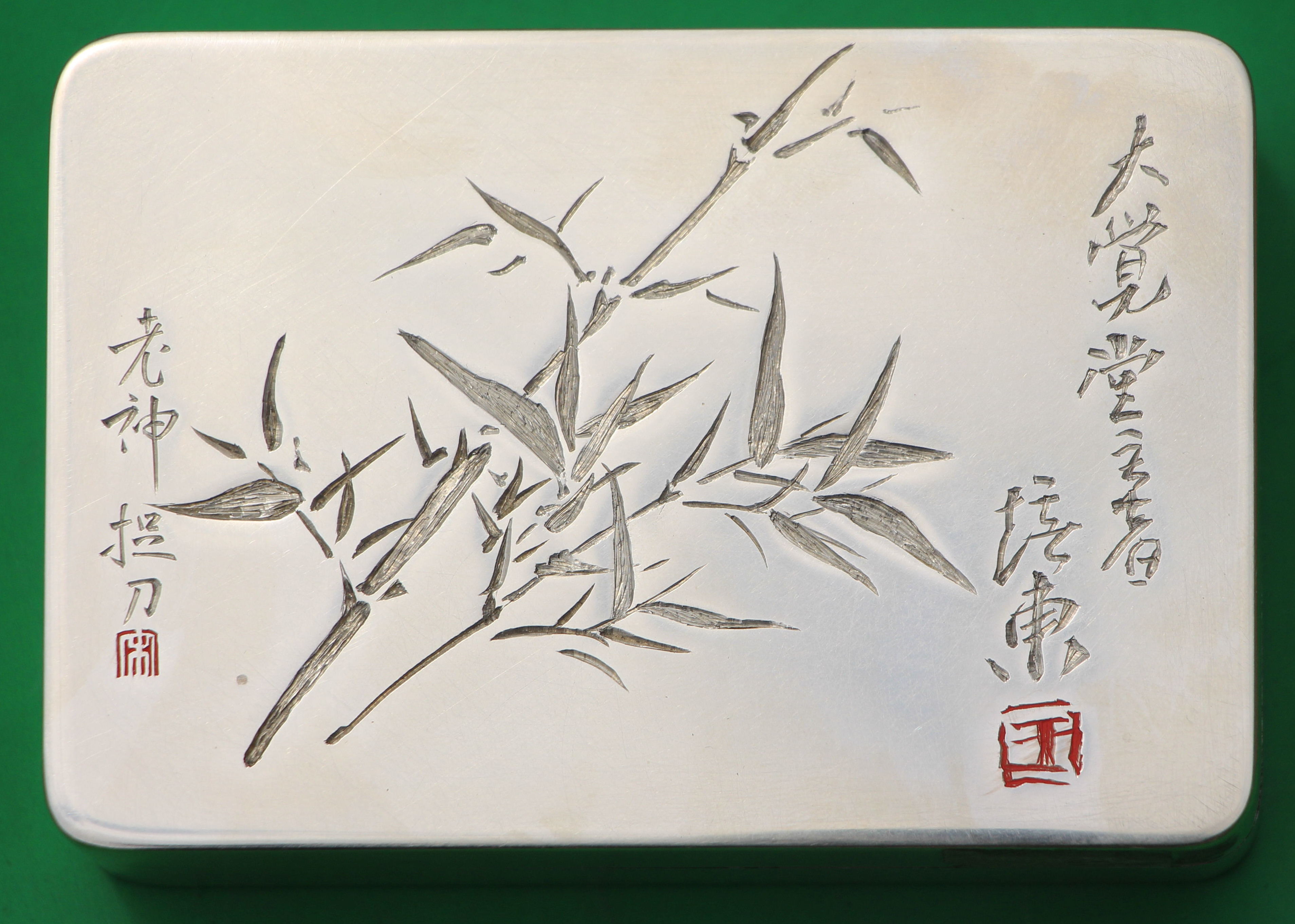刻铜是刻铜艺人用钢刀,在铜质的文房用具上镌刻书画的艺术。刻者以刀代笔,在铜面上镌刻出一幅幅具有强烈金石韵味的书画作品。正是在刻制当中产生的那种独特的刀痕,使画面线条的金石韵味更加强烈,使其比纸上的作品更具“视觉冲击力”。