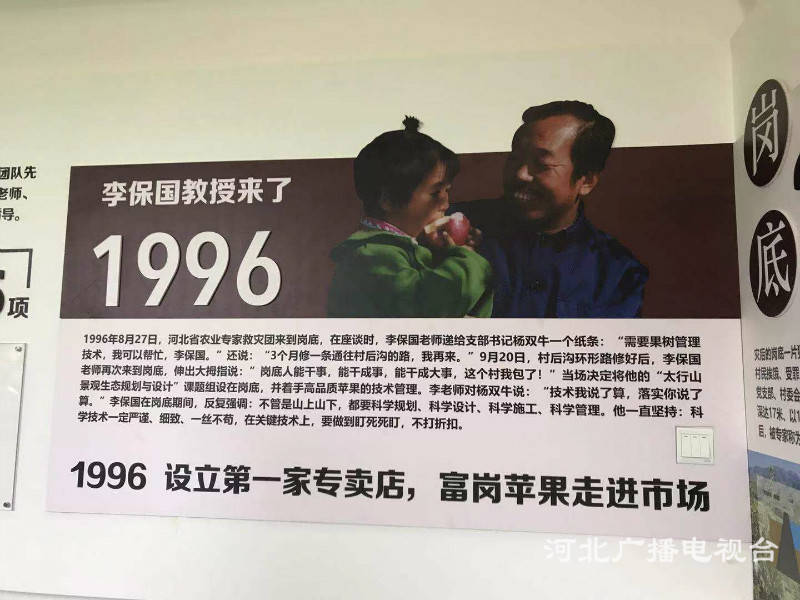 据岗底村党总支书记杨双牛介绍,1996年9月,岗底村请来了河北农业大学教授李保国,从此这个贫困的小山村发生了翻天覆地的变化。当年,李保国教授把“家”搬到了岗底村,把课堂搬到了田间地头,全身心地传授林果生产实用技术。李保国帮助岗底村高标准治理了8000亩山场,并根据岗底村独特的自然环境,在果树中好中选优,优中改良,历经数百次实验,培育出了富岗1号、富岗2号、富岗3号苹果优良品种,并实施了以128道生产工序为核心的无公害绿色食品生产工程。