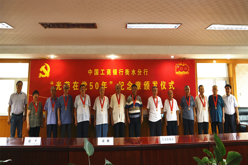 为进一步增强老党员的荣誉感,激励新时期广大党员传承党的优良传统,增强党性修养,弘扬新风正气,6月23日上午,工行衡水分行举行“光荣在党50年”纪念章颁发仪式,为12名党龄50周年以上的老党员颁发纪念章,并向他们致以崇高敬意。