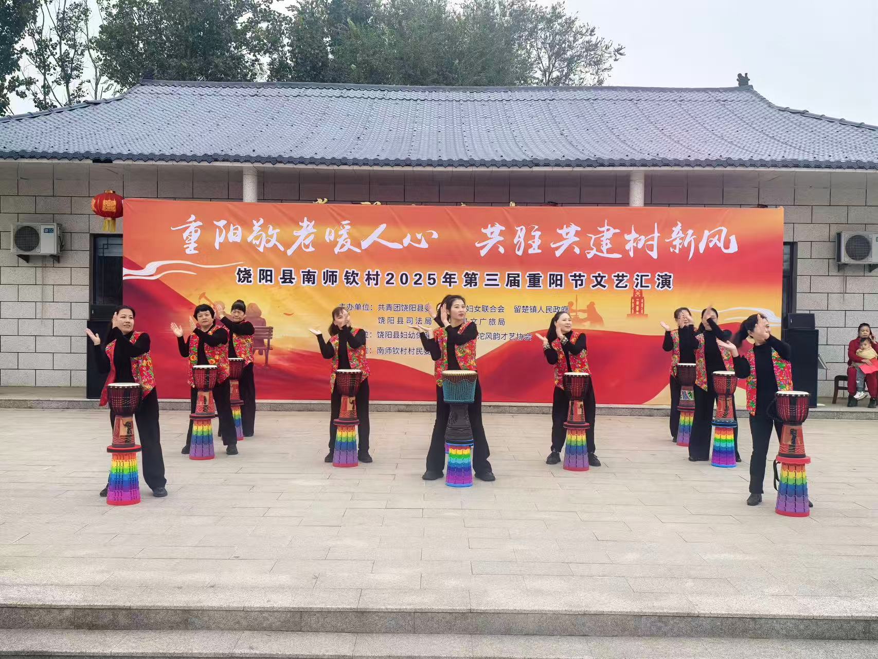 上午8时30分,架鼓队、秧歌队、广场舞队的队员们准备就绪,开始了酣畅淋漓的表演。全村百姓携家带口,前来观看。彭杜乡中心幼儿园孩子们表演的舞蹈《童心向党》,拉开了文艺汇演的序幕。《战鼓鸣》《好日子》《十面埋伏》……架鼓队队员们铆足了劲儿,把手中的鼓槌抡得高高的,鼓声激昂、镲声清脆,喝彩声、叫好声此起彼伏。《活力中国》《再唱山歌给党听》《没有共产党就没有新中国》……舞蹈队的队员们身着鲜艳的演出服装,和着音乐翩翩起舞,用质朴的表演,舞出喜庆、跳出欢畅,传递着祝福祖国的心声。