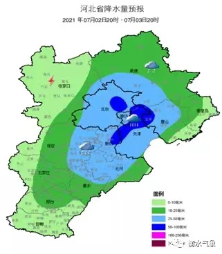 具体天气预报为:7月2日夜间,阴有阵雨或雷雨,局部中雨到大雨,偏北风2~3级,最低气温20到21℃;7月3日,白天:阴东南部有阵雨转多云,夜间:多云,气温:30到21℃;7月4日,多云,气温:32到22℃;7月5日,多云间阴,气温:34到25℃;7月6日,多云,气温:34到24℃;7月7日,多云间阴,有分散性阵雨或雷雨,气温:33到24℃;7月8日,多云间阴,大部有阵雨或雷阵雨,气温:33到23℃;7月9日,多云间阴,大部有阵雨或雷阵雨,气温:33到23℃。