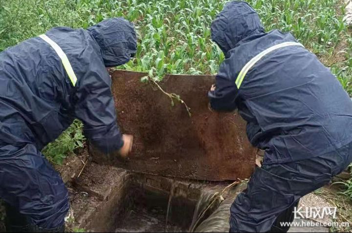 望都县乡镇干部清理村内排水口,加快排涝速度。资料图