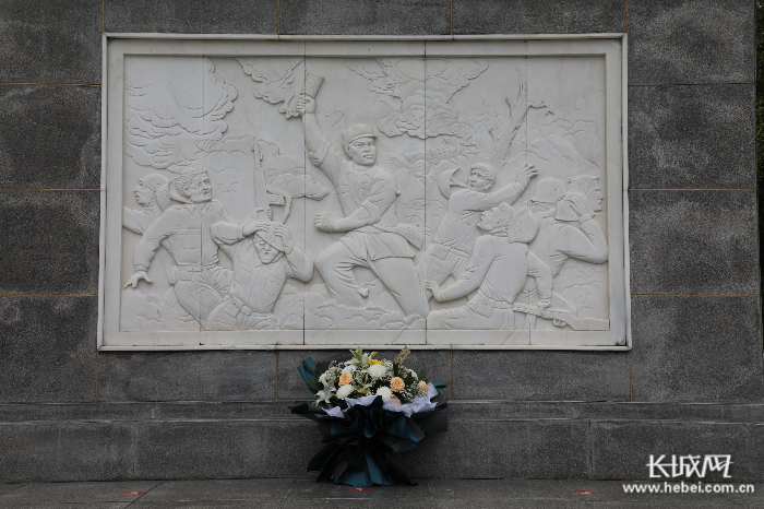 沙河市烈士陵园纪念碑上的浮雕,艺术再现了杨春增壮烈牺牲的场景。长城网记者 王璇 摄