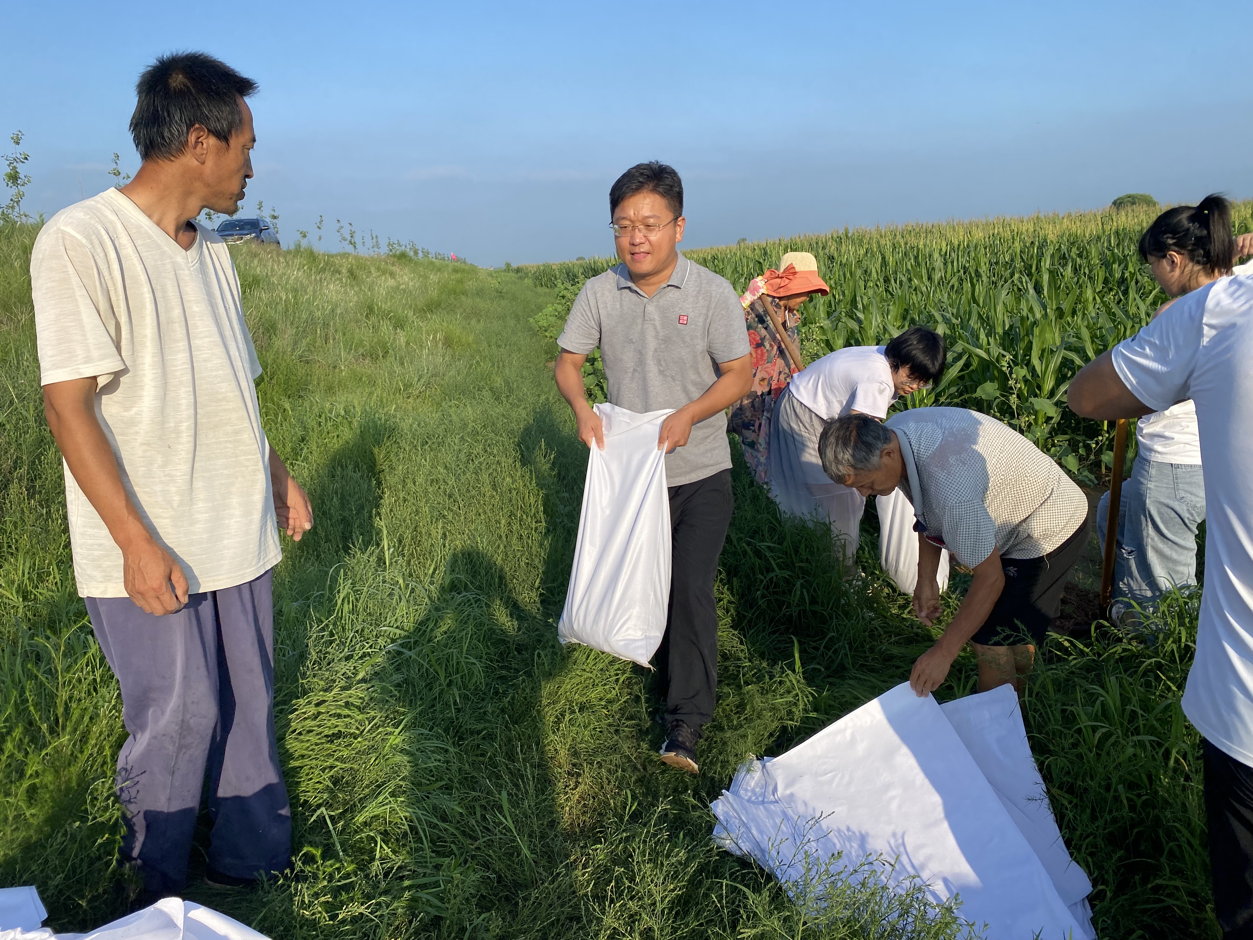 有的人装土袋子,有的人铺设防水布,有的人在忙着运防汛物资……8月1日,在滹沱河南岸大堤武强段,该县北代乡的200余名干部群众在加固大堤险工险段,现场一派忙碌的景象。