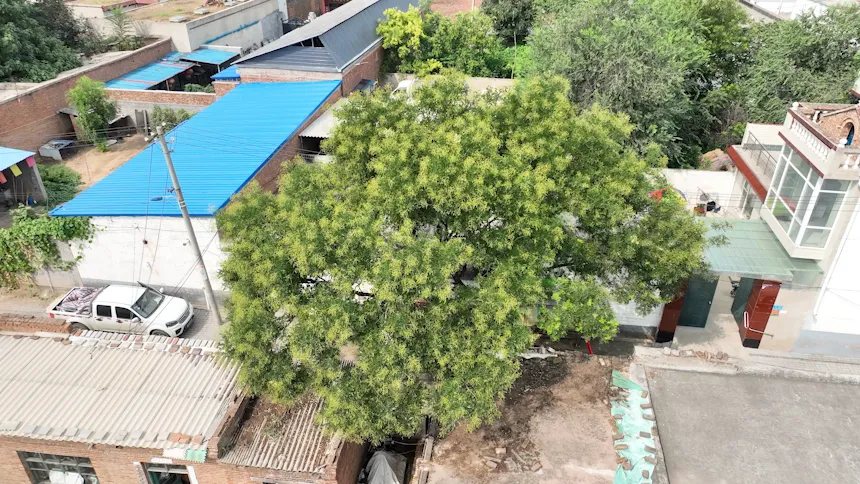 其实,这两棵树原来更高,随着村里排水地势变化,院子已经填埋了四五米,要不应该有十几米高了。