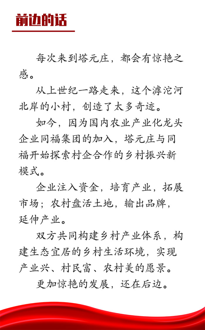 2020年,塔元庄村借力同福集团平台,与同福共同打造了塔元庄同福乡村振兴示范区项目。